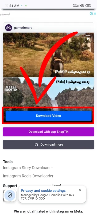 حال که تبلیغات را بستید باید روی گزینه download video کلیک کنید تا دانلود ویدیو آغاز شود.