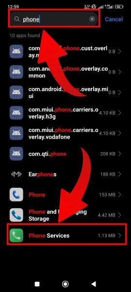 حال که روی این گزینه کلیک کرده اید تمامی نرم افزار های موبایل شما از جمله نرم افزار های سیستمی نیز به شما نمایش داده میشود. طبق تصویر زیر نام آن نرم افزار که قصد برگرداندن آن را دارید سرچ کرده و وقتی که نمایان شد روی آن کلیک کنید تا اطلاعات برنامه نمایش داده شود. ما در این مقاله برنامه تماس یا phone را انتخاب کرده ایم.